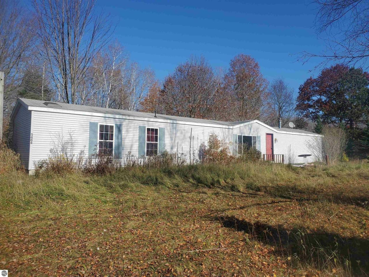 Great location between Beulah and Frankfort and walking distance to the Betsie River and Gwen Frostic's. Beautiful 5 wooded acres with 1280 sq ft single wide mobile home on permanent block foundation. 3 bedroom 2 bath, large living, kitchen and dining area, with sliding glass door leading to private deck area and fenced in back yard. Primary bedroom as private bath, 2nd bedroom in very nice in size. The house had extensive water damage to the floors throughout the house from broken water pipes. House appear to be in good shape other that the floors. House is being sold as is. Item in house, shed and outdoor play set stay.